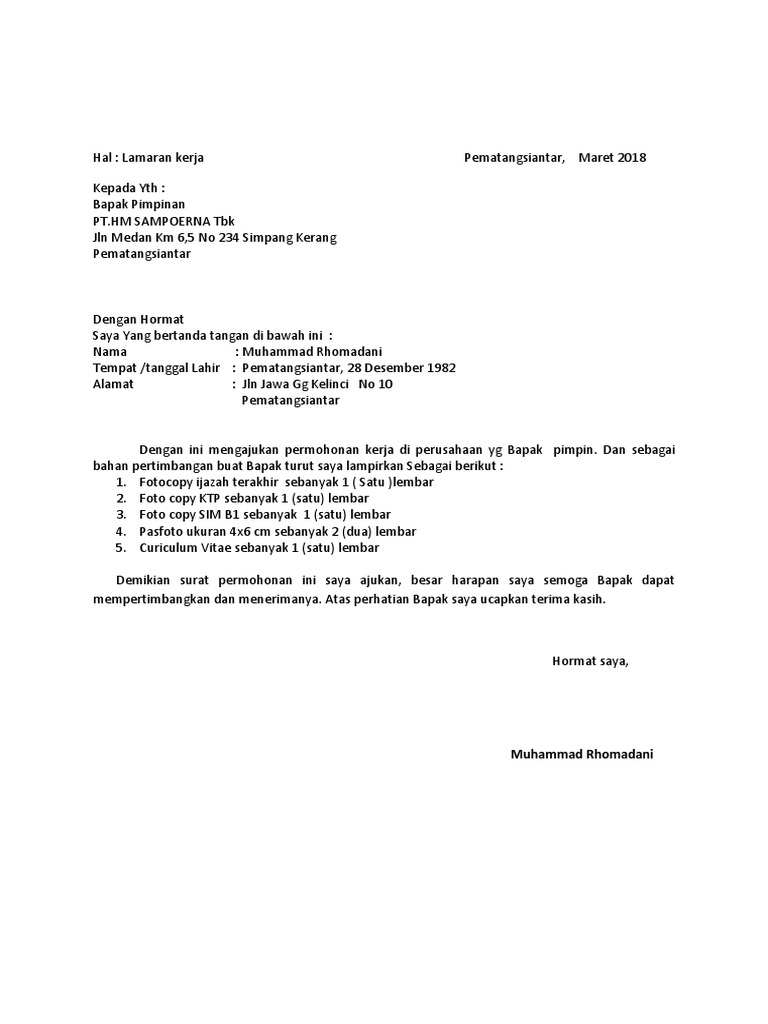 Surat lamaran kerja adalah surat yang digunakan sebagai legalitas untuk mengajukan permohonan mendapatkan pekerjaan pada perusahaan yang dituju. Dalam contoh surat lamaran kerja agar mudah diterima hobi menjadi salah satu hal yang bisa dijadikan daya tarik lain. Contoh surat lamaran kerja umum, bank, karyawan, alfamart, pt, sekolahan, formal, fresh graduate, bahasa inggris, via email, tulis surat lamaran kerja adalah surat yang digunakan untuk melakukan permohonan mendapatkan pekerjaan sesuai pengalaman pada perusahaan tertentu. Afro insan memanah yang diiklankan di kedaulatan rakyat pada tanggal 9 maret 2017. Sebelum kita lanjut ke contoh surat lamaran, ada baiknya kamu membaca kriteria dan tips untuk membuat surat lamaran kerja yang baik dan benar. Bersama dengan surat ini saya mengajukan diri untuk bergabung ke tim pemasaran di pt sumber sejahtera. Rekomendasi paling lengkap dan terbaru. Surat lamaran di atas hanyalah sebuah contoh. Ada baiknya untuk menuliskan infomasi tentang pengalaman dan keahlian yang anda miliki agar anda memiliki nilai plus dimata hrd. Surat lamaran kerja di perusahaan swasta. Contoh surat lamaran kerja atau cara membuat surat lamaran kerja ke perusahaan swasta. Adapun bagian pekerjaan yang saya maksud agar dapat bekerja dibagian pemasaran di pt indofood cbp 28. Contoh surat lamaran kerja guru swasta.