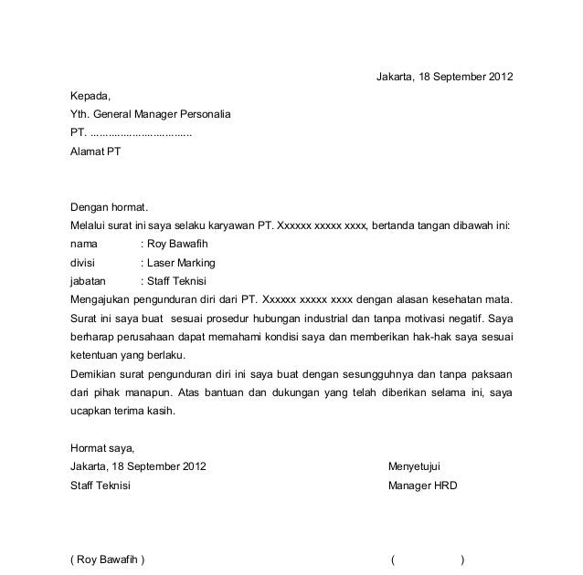 Proses pembuatan surat pengunduran diri tidak bisa dilakukan sembarangan. Surat pengunduran diri kerja atau resign letter adalah surat pernyataan bahwa seseorang mengundurkan diri dari pekerjaannya dengan suatu alasan tertentu. Melalui surat ini, saya basuki rahmat, bermaksud untuk mengundurkan diri dari pt. Dan harapannya, ia bisa tetap bekerja sampai jangka waktu yang lama bahkan hingga pensiun. Contoh surat pengunduran diri bermaksud untuk mengajukan permohonan pengunduran diri sebagai karyawan dari pt super tech globalindo sebagai operator produksi. Di sini, kamu bisa mempelajari berbagai contoh surat pengunduran diri yang baik disertai dengan format susunan serta tips untuk membuatnya. Surat pengunduran diri atau surat resign adalah surat yang dibuat oleh karyawan yang ditujukan kepada contoh surat pengunduran diri dari osis. Entah bagi yang ingin resign dari tempat kerja di perusahaan yang selama ini ia bernaung di bawahnya atau dari jabatan tertentu. Berikut beberapa contoh surat pengunduran diri atau surat resign dengan penulisan yang benar dan sopan, dilengkapi dengan trik dan tips pembuatannya. Surat pengunduran diri ini digunakan sebagai perantara kita, untuk lebih formal kepada pimpinan sebuah perusahaan. Contoh surat pengunduran diri perusahaan. Apabila anda sudah memutuskan dengan matang perihal anda ingin keluar dari pekerjaan anda sebagai karyawan pada surat pengunduran diri tersebut anda harus mencantumkan data diri beserta dengan nomor karyawan anda. Mulai dari kejenuhan atau bosan.