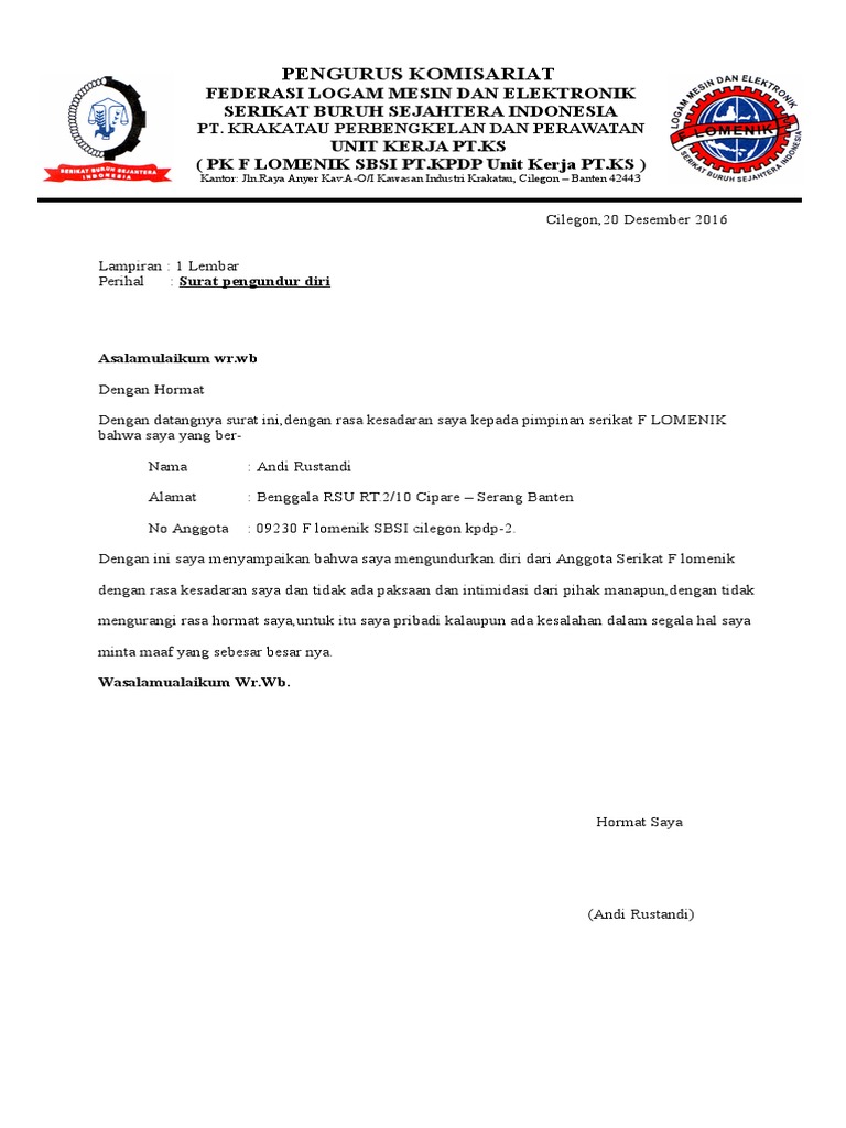 Bersama surat ini saya bermaksud mengajukan permohonan pengunduran diri dari perusahaan yang bapak/ibu pimpin pertanggal 19 april 2016. Entah bagi yang ingin resign dari tempat kerja di perusahaan yang selama ini ia bernaung di bawahnya atau dari jabatan tertentu. Bekerja merupakan kegiatan setiap orang setelah menempuh pendidikan. Yang membuat pernyataan, ponaryo astuji. Pembentukan serikat pekerja (forum komunikasi karyawan pt, terra cotta indonesia dilandasi atas dasar sukarela keinginan dari pekerja buruh sendiri dengan senantiasi memegang prinsip bebas, terbuka, mandiri.