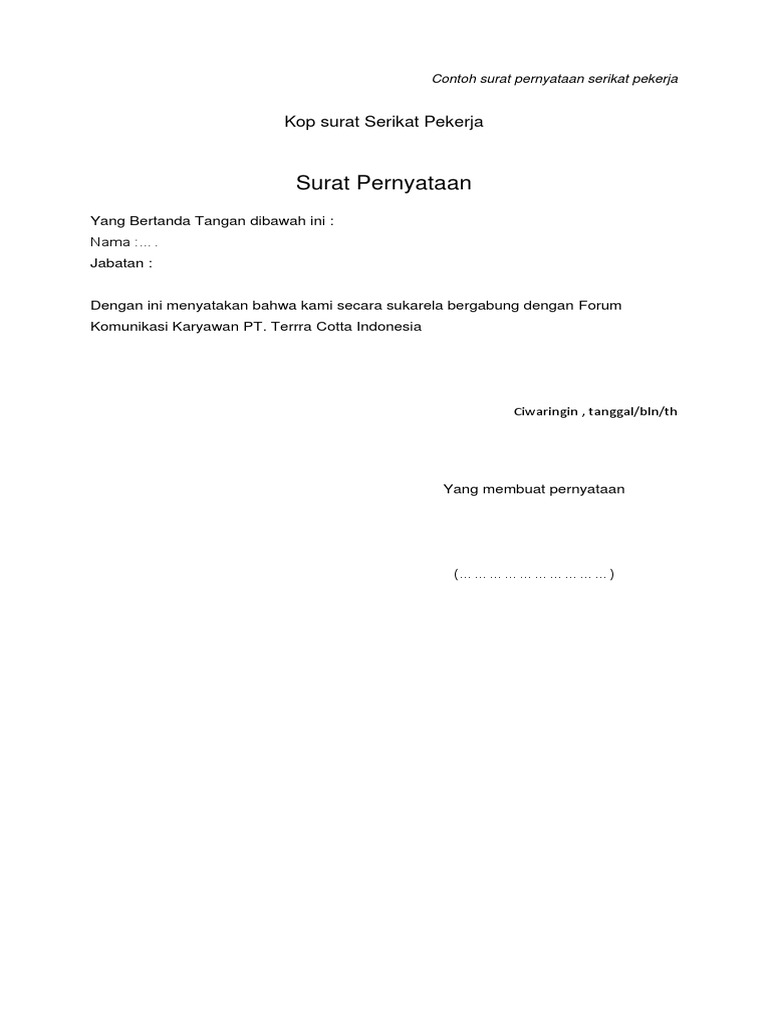 Pembentukan serikat pekerja (forum komunikasi karyawan pt, terra cotta indonesia dilandasi atas dasar sukarela keinginan dari pekerja buruh sendiri dengan senantiasi memegang prinsip bebas, terbuka, mandiri. Disini ini akan ditunjukan beberapa contoh surat pengunduran diri dari tempat bekerja lama kamu. Anda hanya cukup mengisi bagian yang rumpang pada contoh surat pengunduran diri diatas dengan data diri dan alasan anda untuk mengundurkan diri dari perusahaan tempat anda bekerja. Entah bagi yang ingin resign dari tempat kerja di perusahaan yang selama ini ia bernaung di bawahnya atau dari jabatan tertentu. Contoh surat pengunduran diri dari jabatan.
